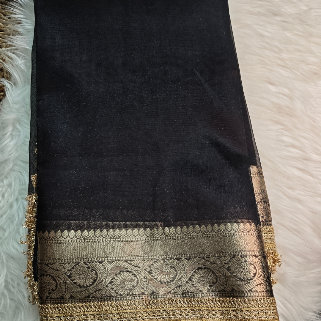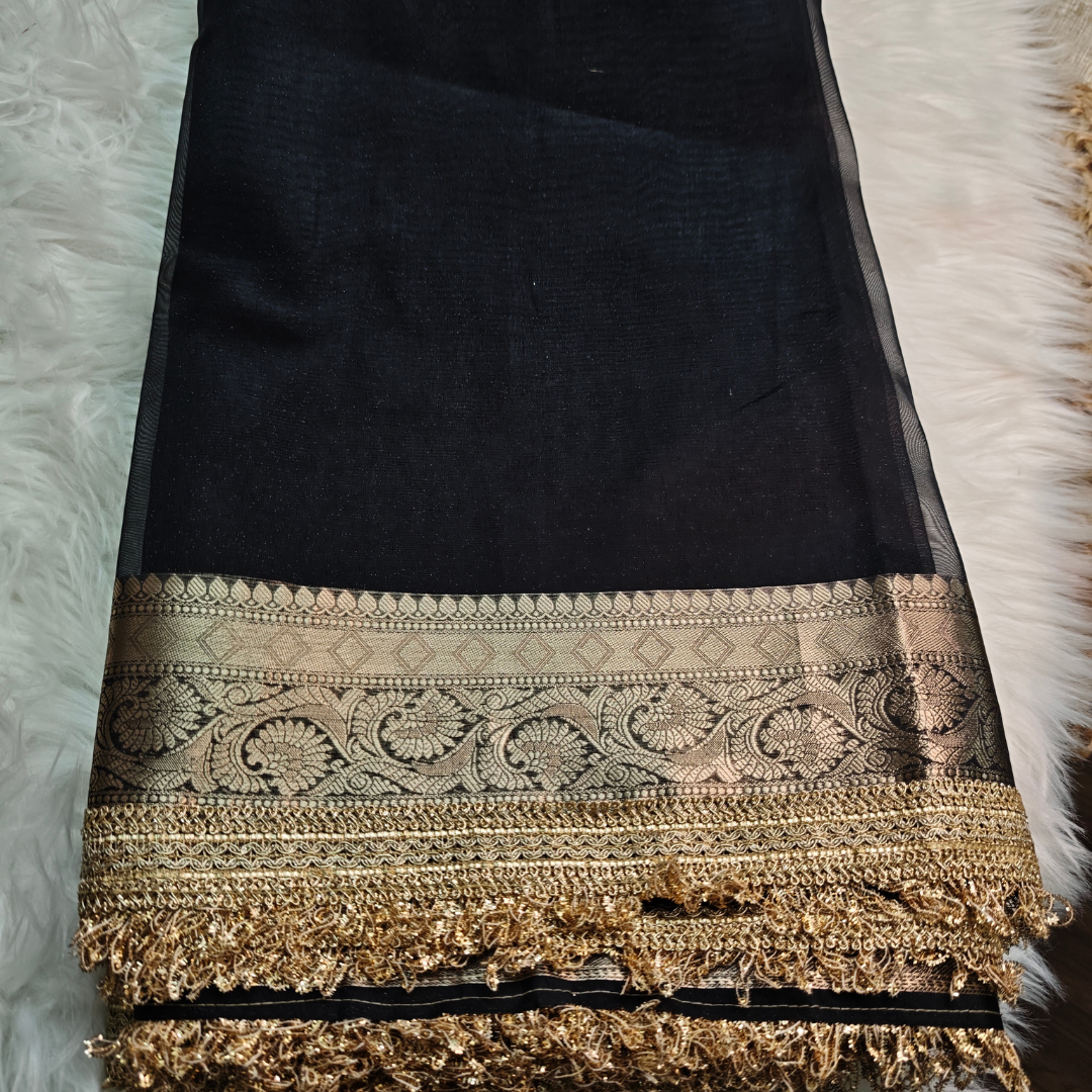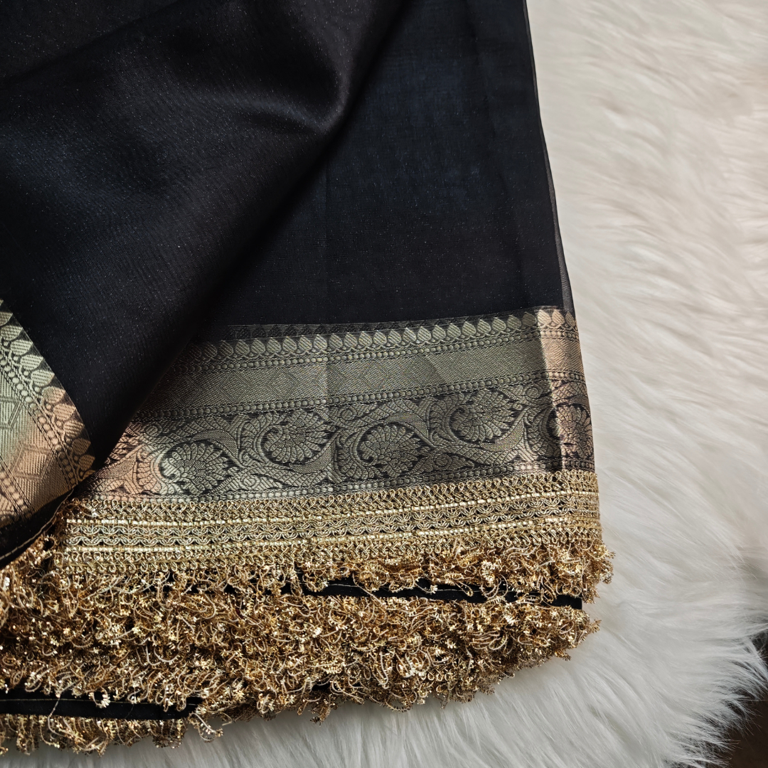 This saree features a luxurious tissue woven border enhanced with intricate lace detailing, adding richness and texture to the overall design. The classic black shade paired with gold accents makes it an ideal choice for evening events, festive gatherings, and special occasions.