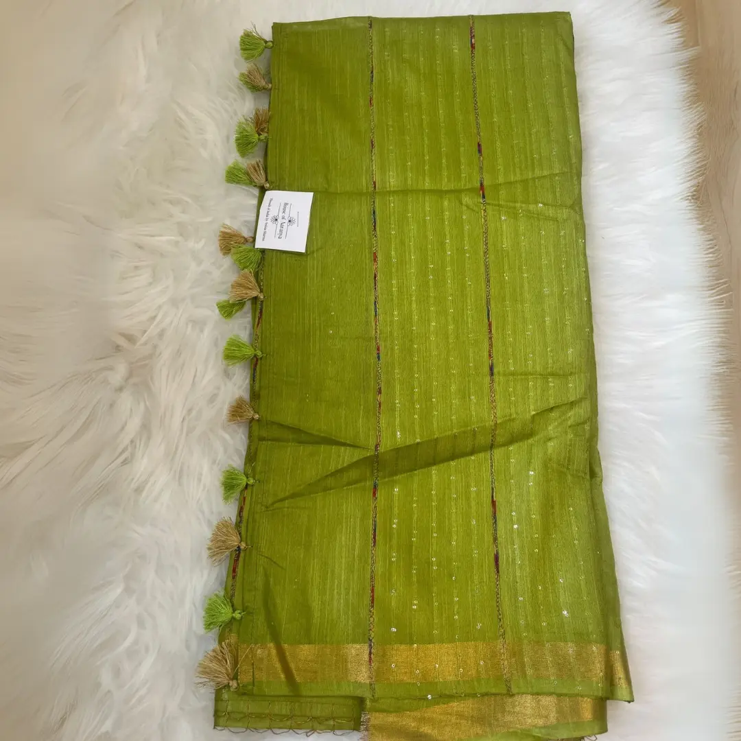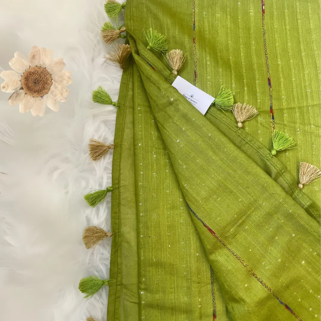 Embrace the charm of Indian craftsmanship with our Chhattisgarh Silk Saree, meticulously handwoven to perfection. The rich green hue and delicate tassel detailing enhance its traditional allure. This lightweight saree drapes effortlessly, blending heritage with modern sophistication. Perfect for weddings, festivals, and graceful evening gatherings — a true reflection of timeless elegance and artistry.