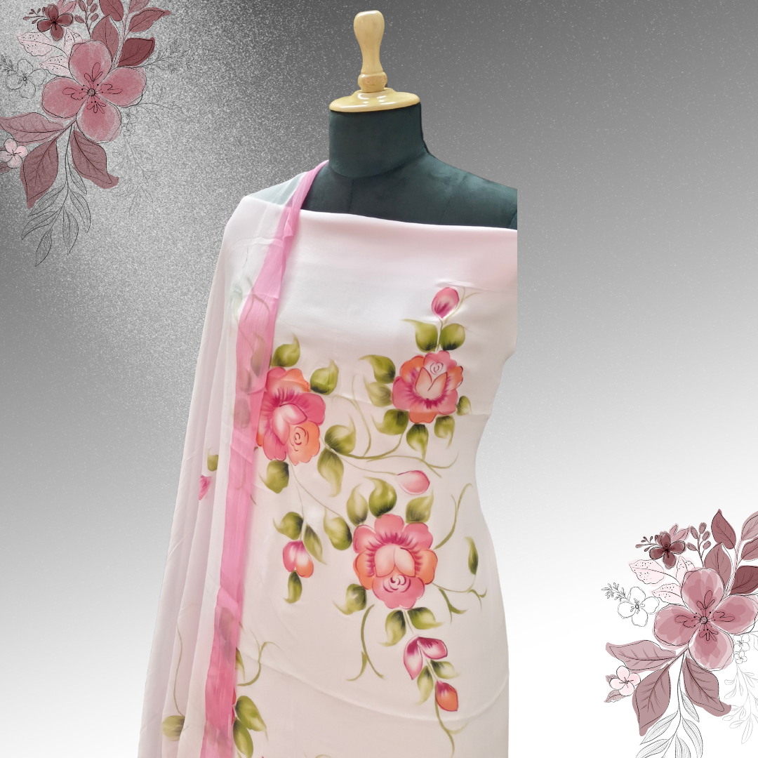 Elegant pure Chinon silk suit set paired with a lightweight chiffon dupatta, featuring delicate hand-painted floral artwork for a graceful, feminine look.