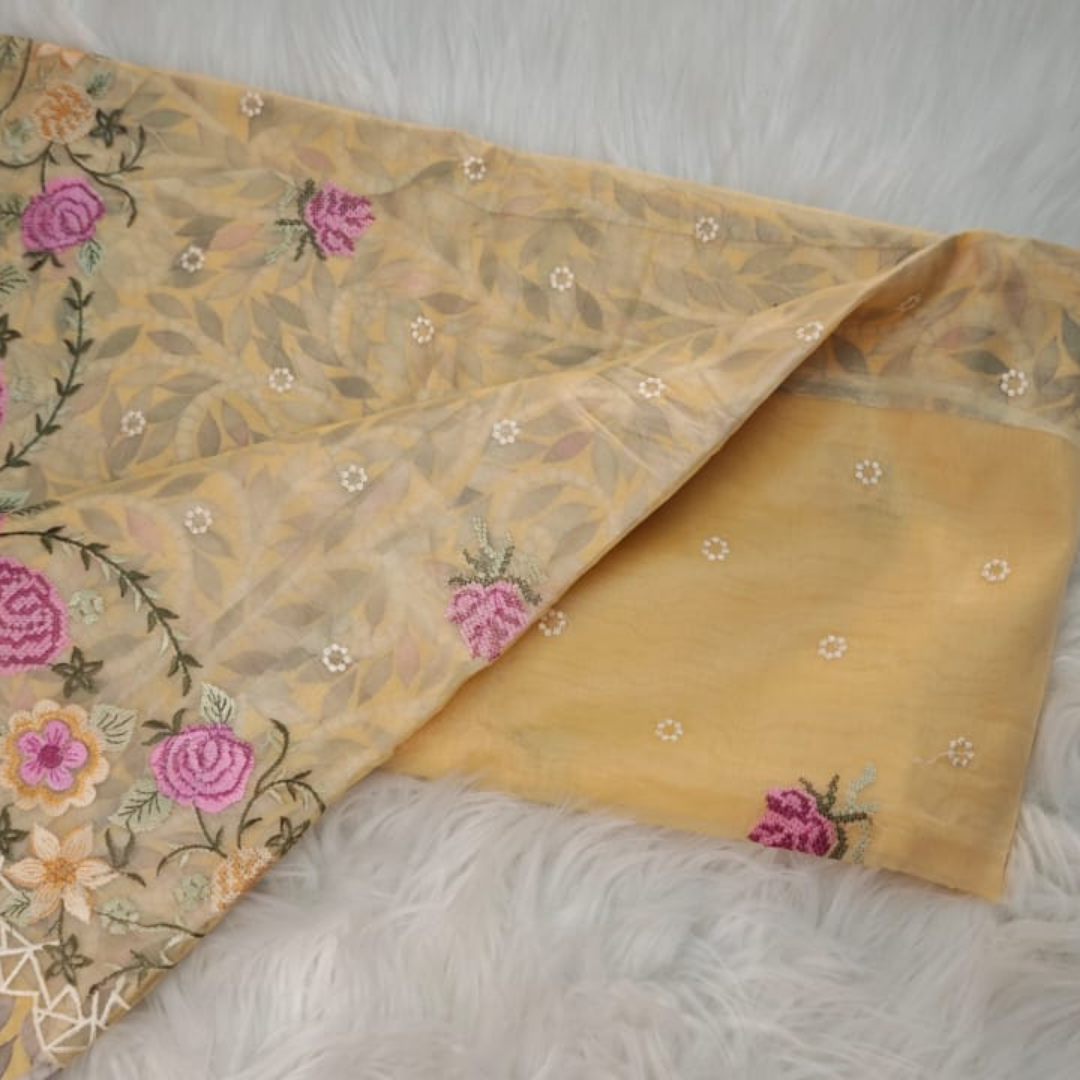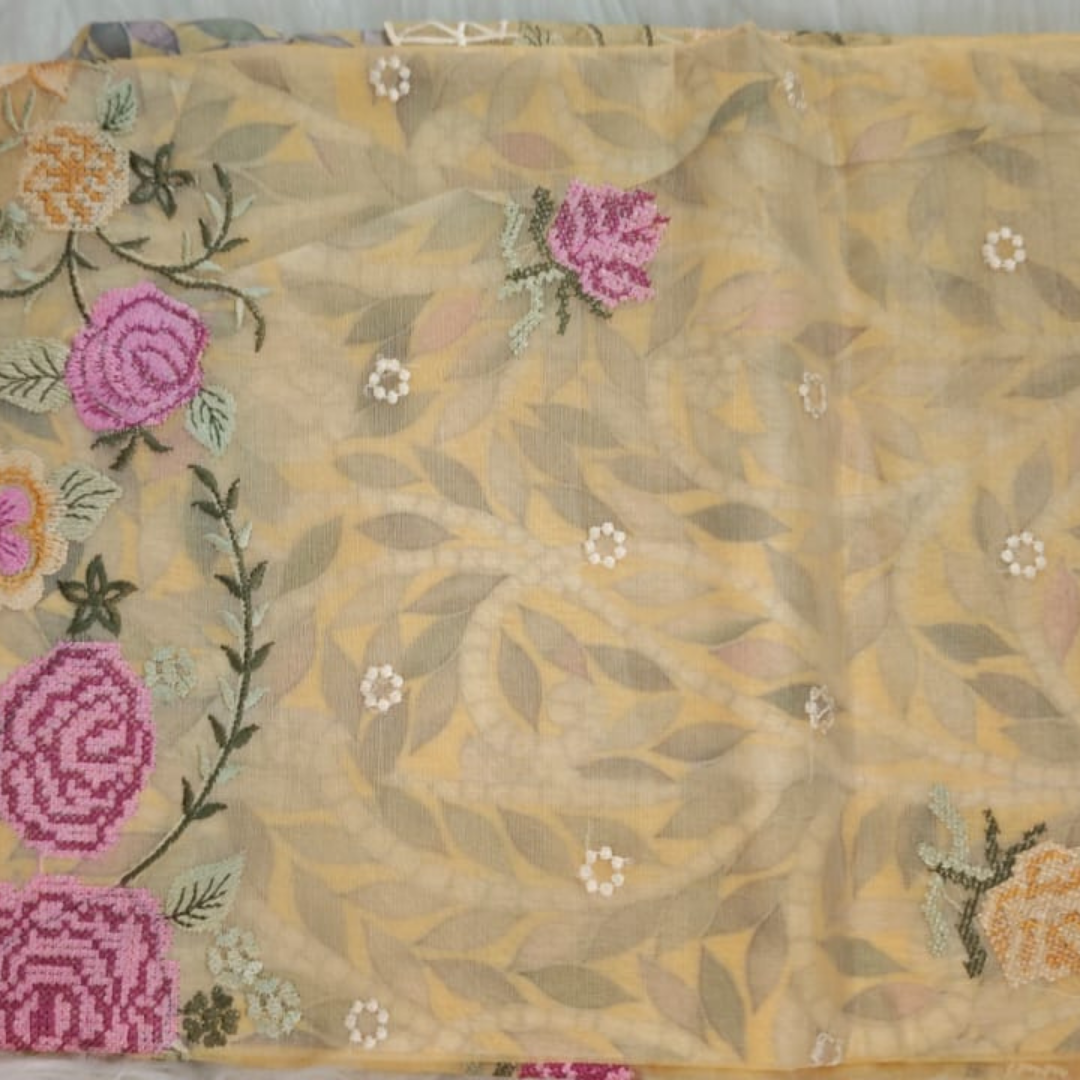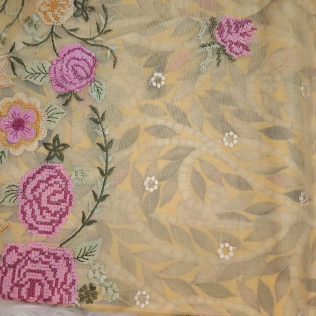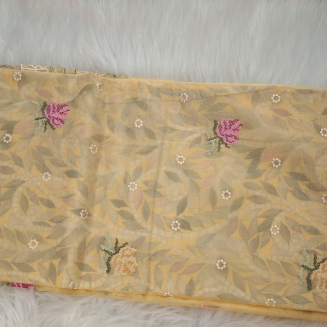 Designed for modern elegance, this saree showcases delicate hand-style embroidery with floral patterns that enhance its charm. Perfect for festive occasions, casual gatherings, or daytime events, it offers a sophisticated yet effortless look.