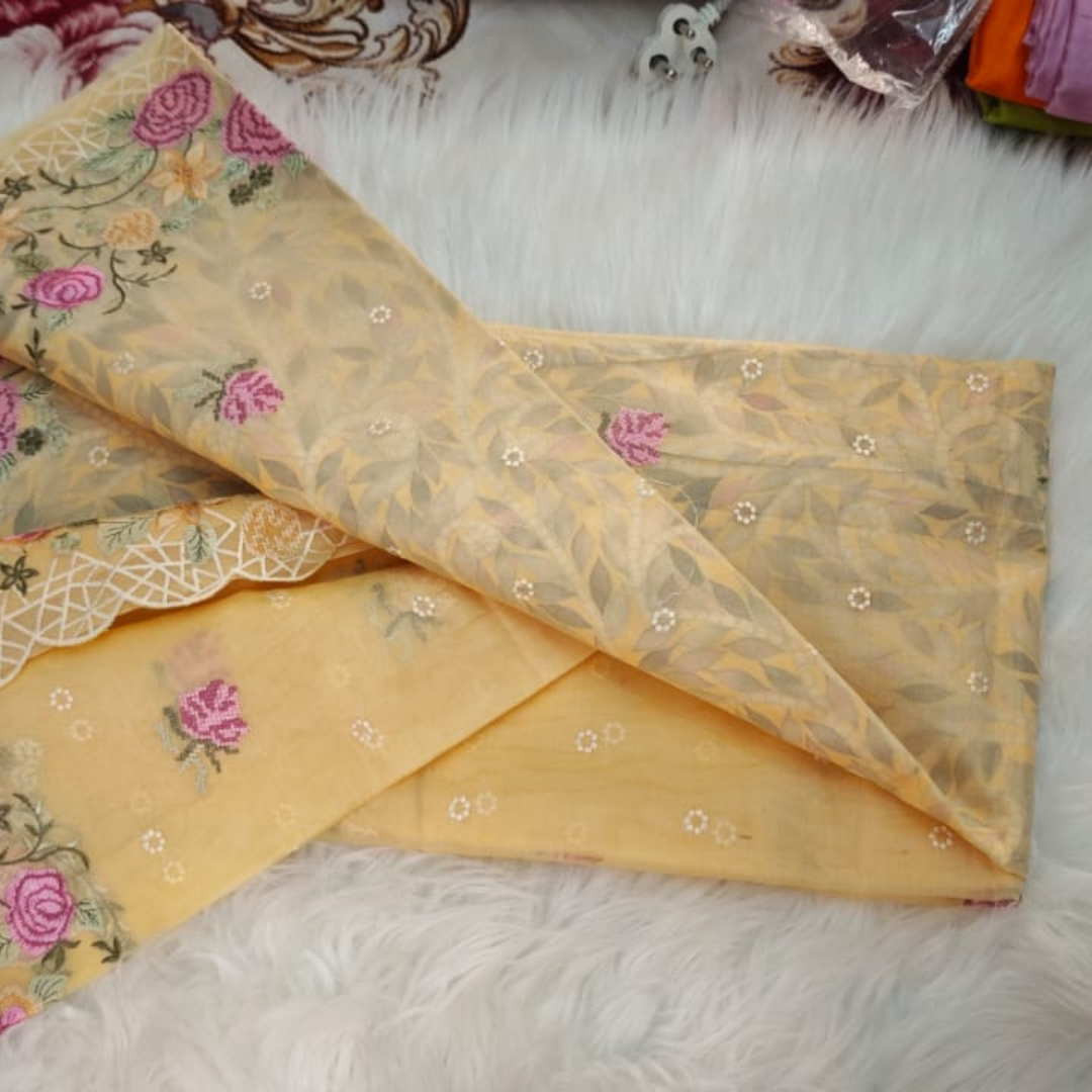 Elevate your ethnic wardrobe with this premium golden tissue cotton saree, crafted to perfection with soft, breathable fabric and intricate floral embroidery. The lightweight texture ensures all-day comfort, while the subtle sheen of tissue fabric adds a luxurious touch.