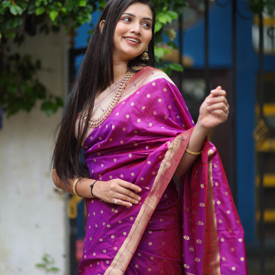 Elevate your ethnic style with this stunning Magenta Paithani Silk Saree, a perfect blend of tradition and elegance. Crafted from fine-quality silk, this saree features delicate small booti motifs across the body, adding a refined and graceful touch.