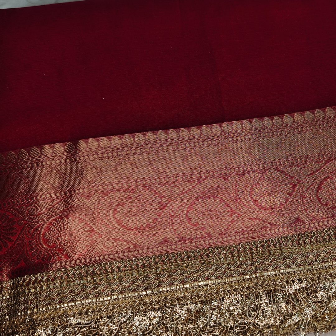 The saree is enhanced with a delicate zari border, giving it a refined traditional touch while keeping the overall look sophisticated and understated. The rich mehroon shade makes it a perfect choice for festive occasions, evening parties, and special gatherings.