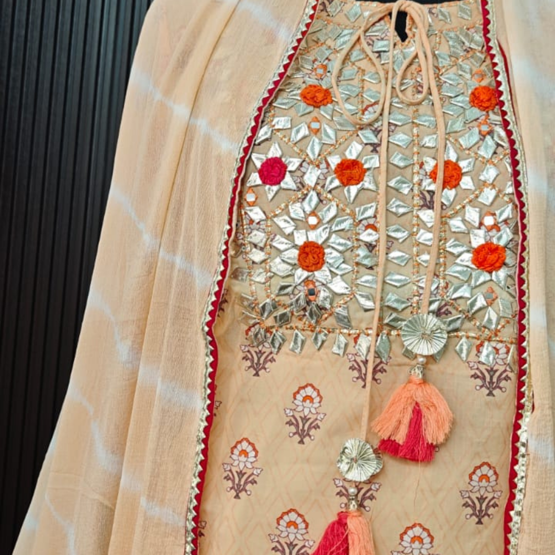 The kurta is adorned with heavy gota patti work combined with mirror detailing, giving it a rich and traditional appeal. The delicate floral accents and handcrafted design enhance its premium look.