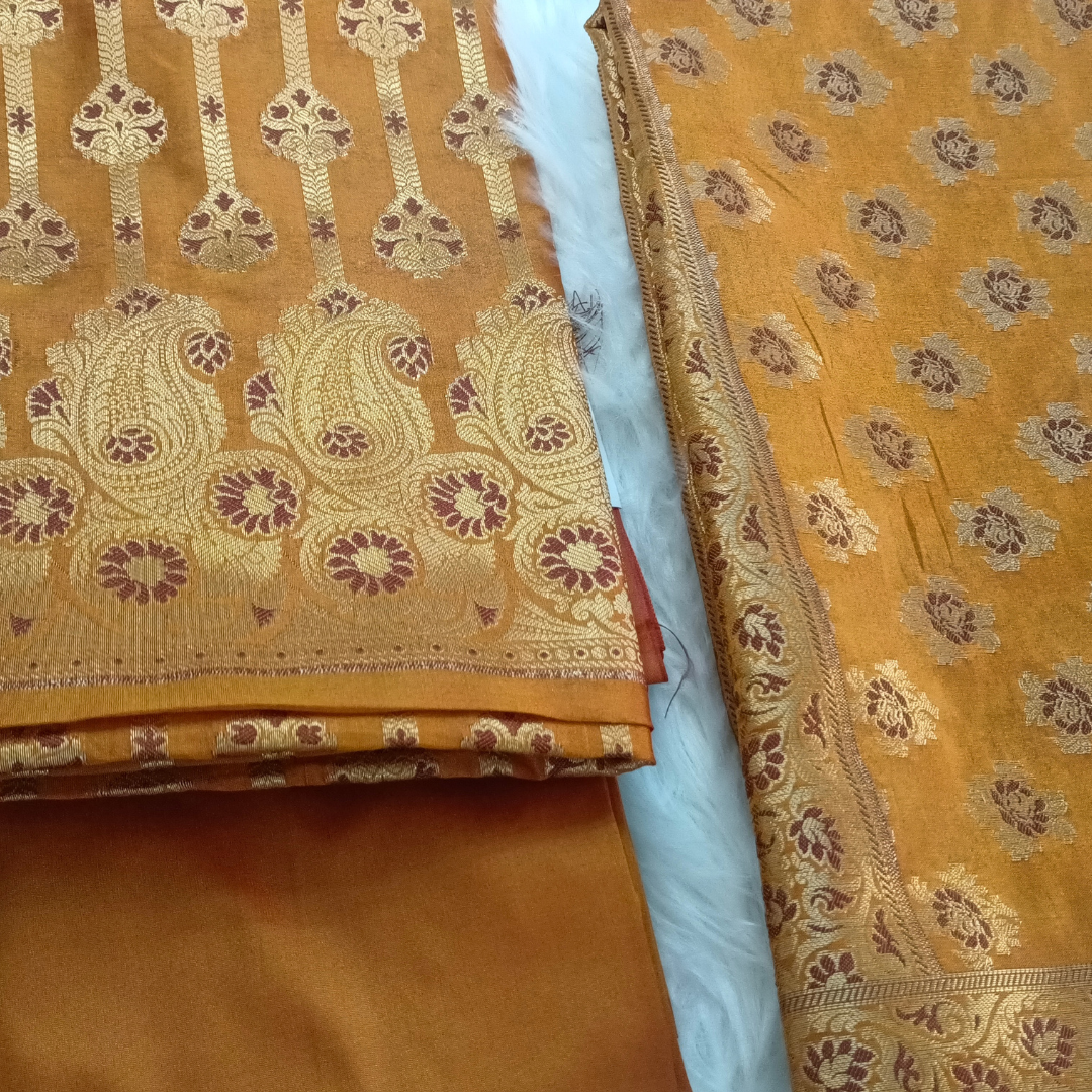 Add a touch of royalty to your ethnic wardrobe with this stunning Mustard Chinia Silk Banarasi Suit Set. Crafted from premium-quality Chinia silk, this outfit offers a soft, lightweight texture with a rich and luxurious feel.