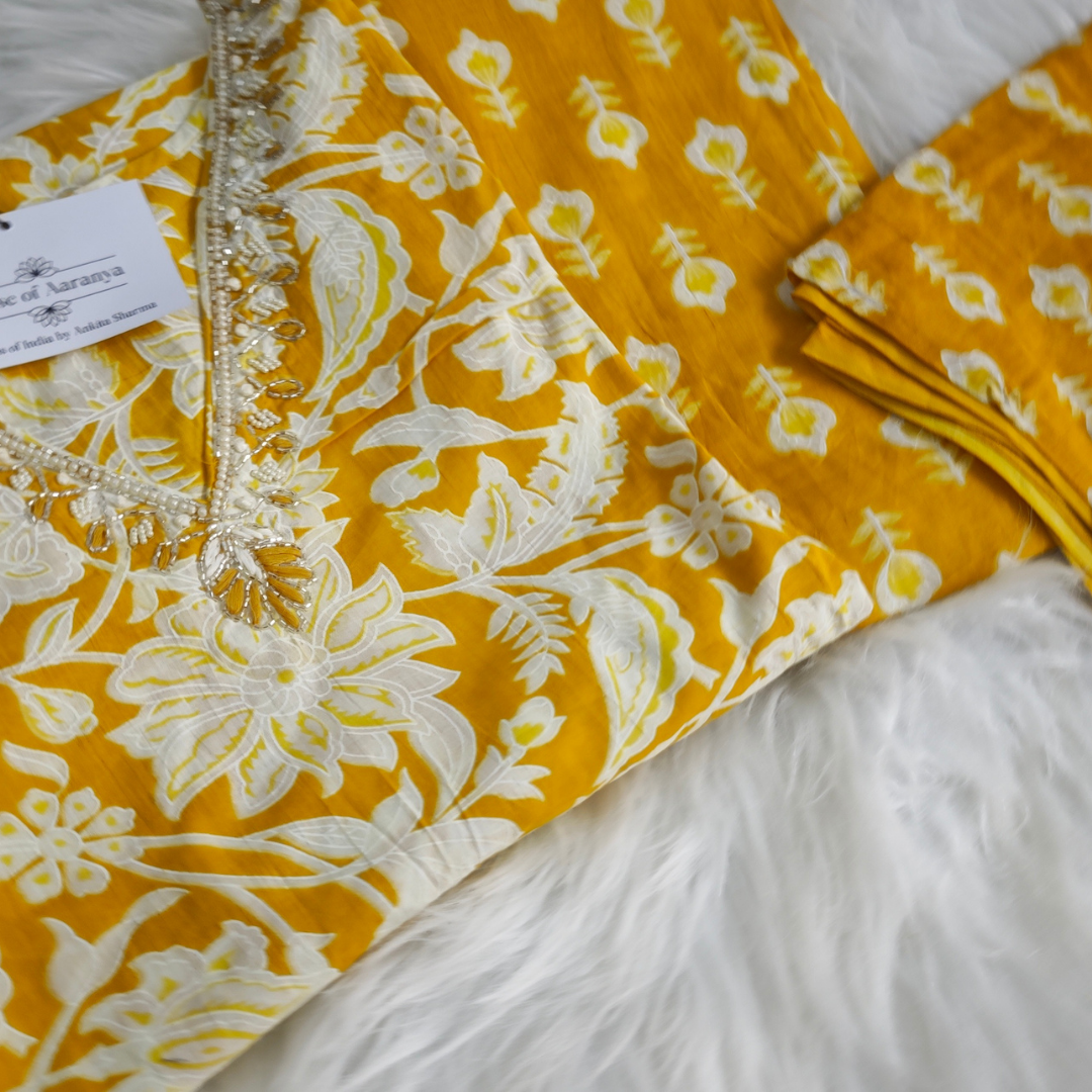 Graceful mustard cotton suit set featuring delicate floral prints and elegant pearl work on the neckline, perfect for summer and festive wear.