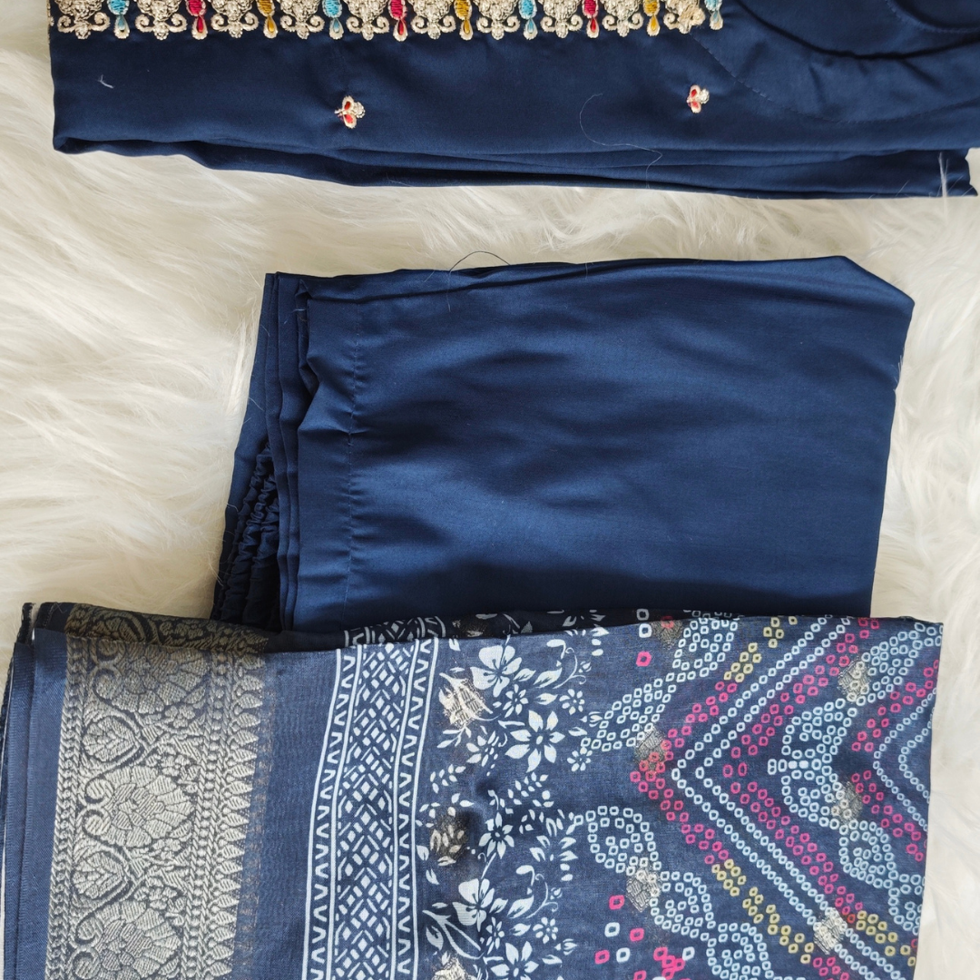 Step into elegance with this stunning navy blue silk 3-piece suit set, designed to give you a rich and sophisticated look. Crafted from premium silk fabric, the outfit offers a smooth texture with a subtle sheen, making it ideal for festive and special occasions.