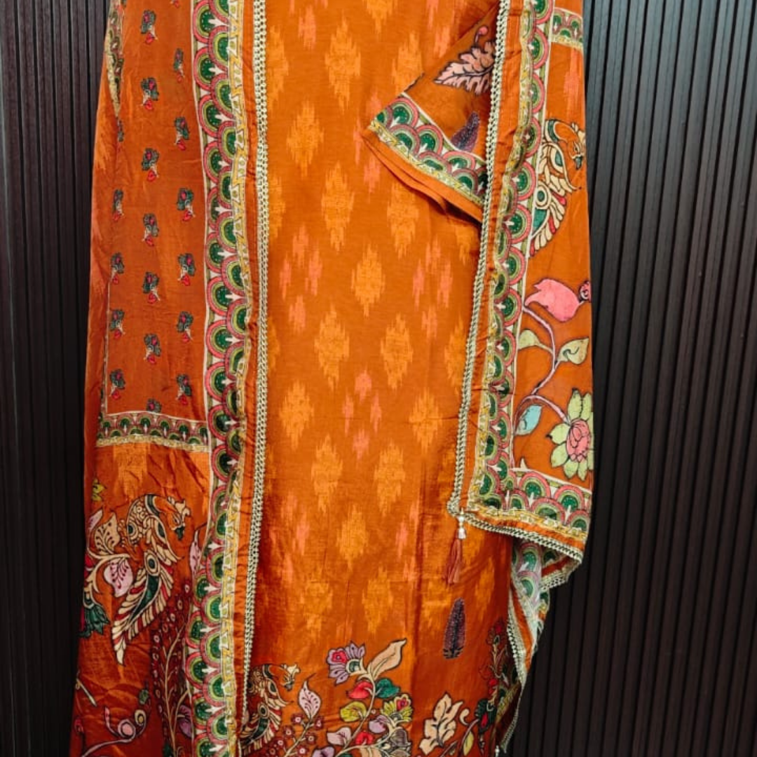 The suit features subtle detailing with intricate work on the neckline, enhancing its overall appeal. The highlight of this ensemble is the beautifully designed Kalamkari dupatta, showcasing traditional prints and vibrant patterns that add a rich ethnic touch.
