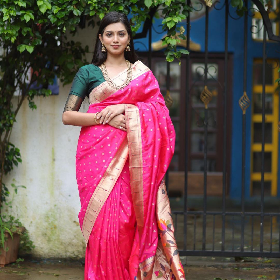 Step into timeless elegance with this exquisite Pink Paithani Silk Saree, designed for women who appreciate tradition with a touch of sophistication. Crafted from premium silk, this saree showcases fine small booti motifs across the body, adding subtle charm and grace.