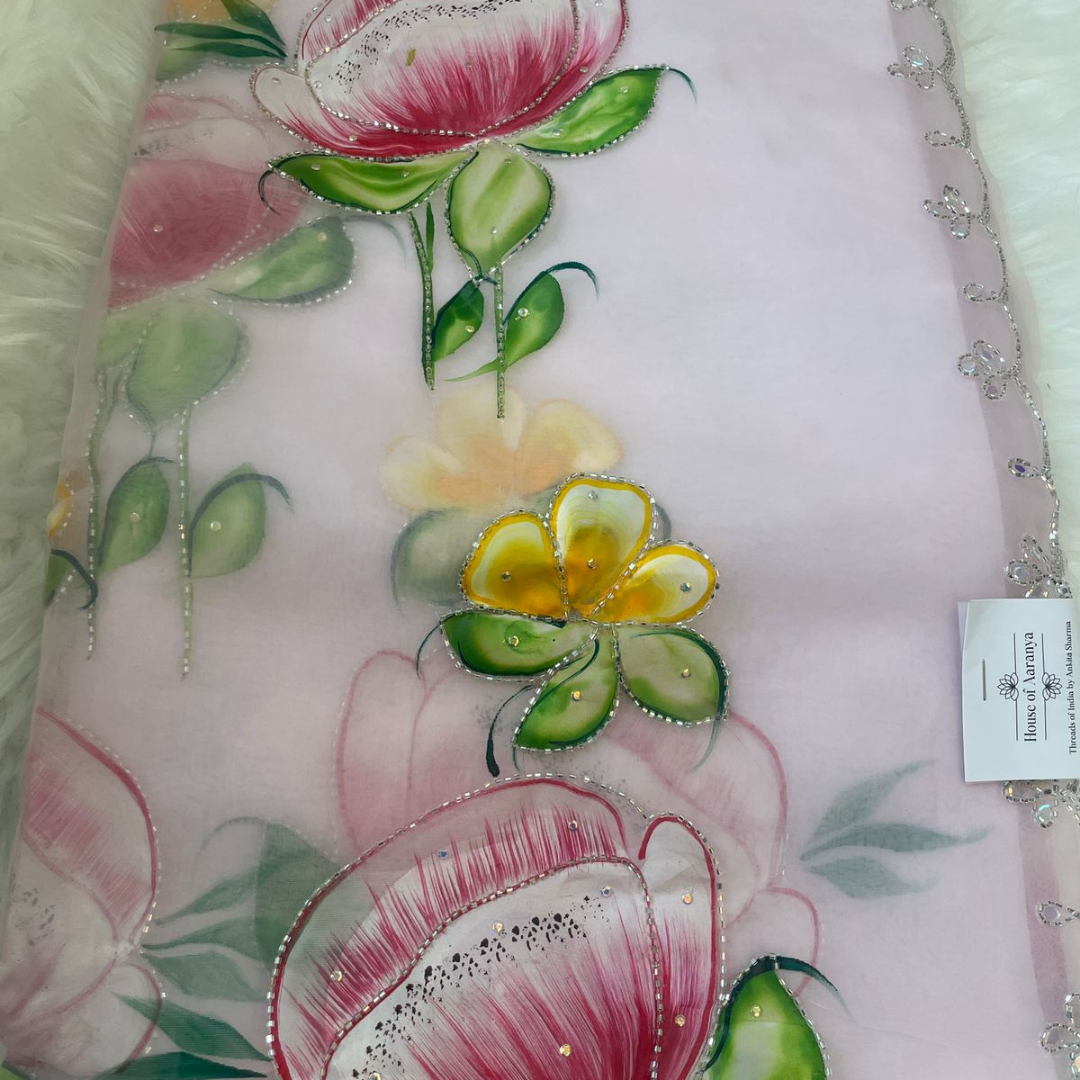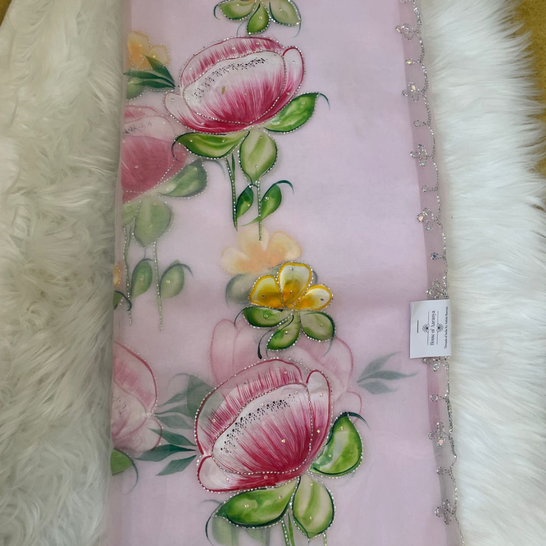 Step into elegance with this Pure Tissue Saree featuring exquisite hand-painted floral artwork and fine embroidery detailing. Designed for those who appreciate artistry, this saree showcases beautifully painted floral motifs in soft pastel tones, enhanced with delicate embellishments for a refined look.