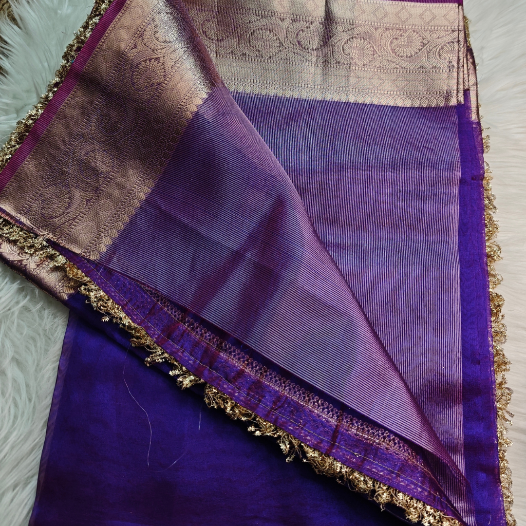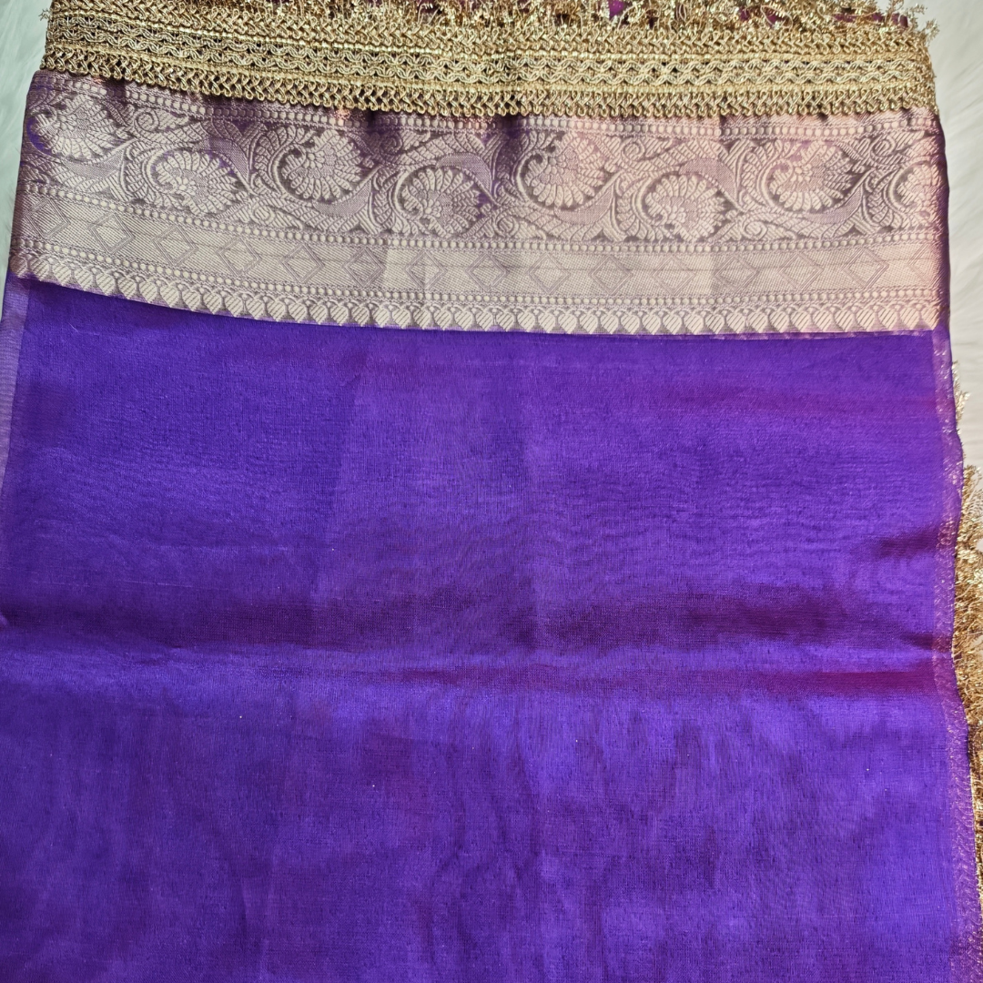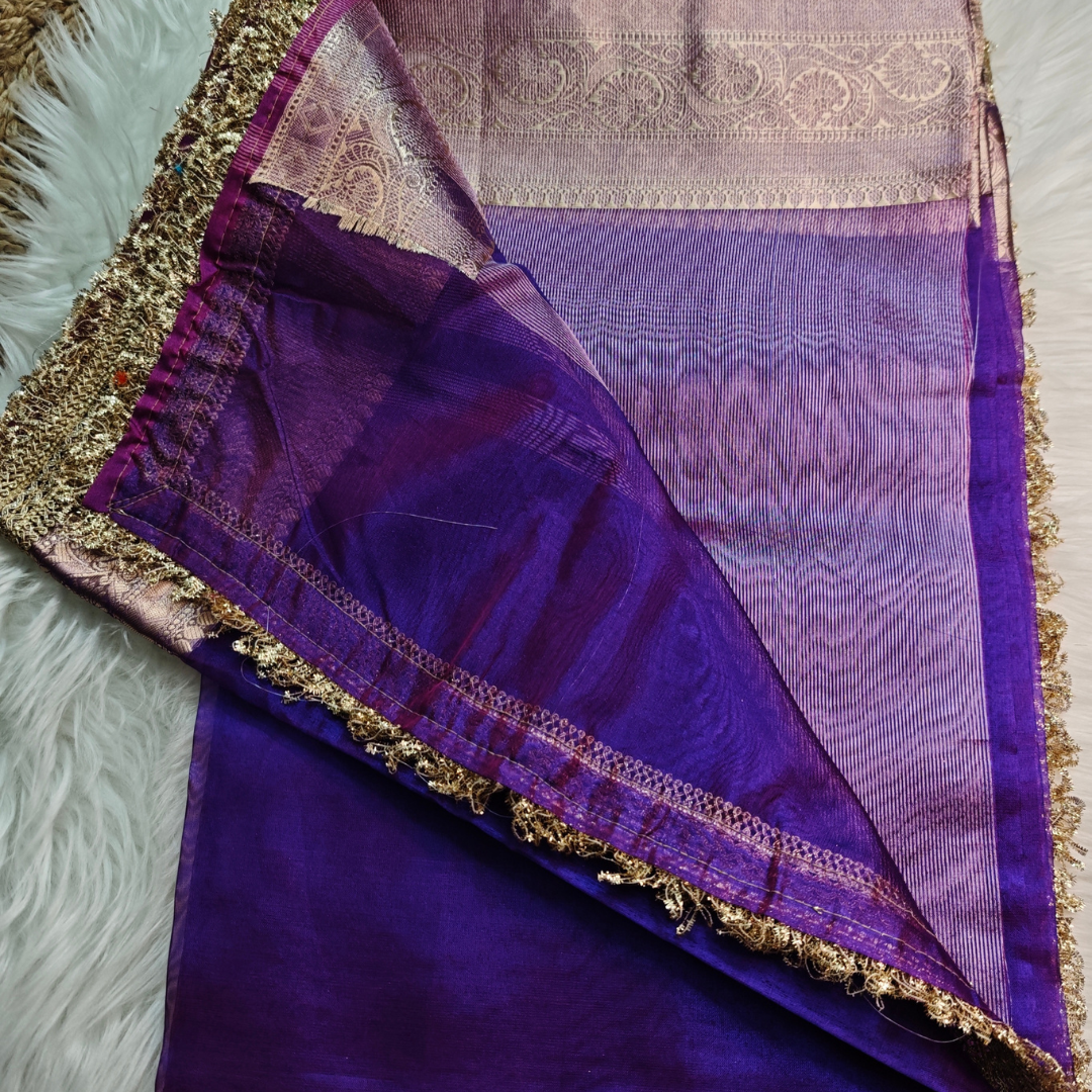 Add a touch of royalty to your wardrobe with this stunning purple organza tissue saree, crafted to deliver elegance and sophistication. The lightweight and sheer fabric drapes beautifully, offering both comfort and a luxurious look.