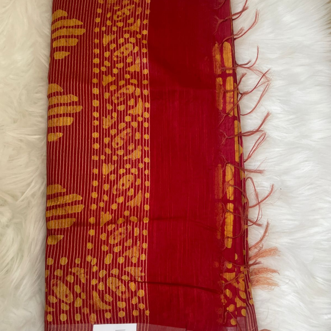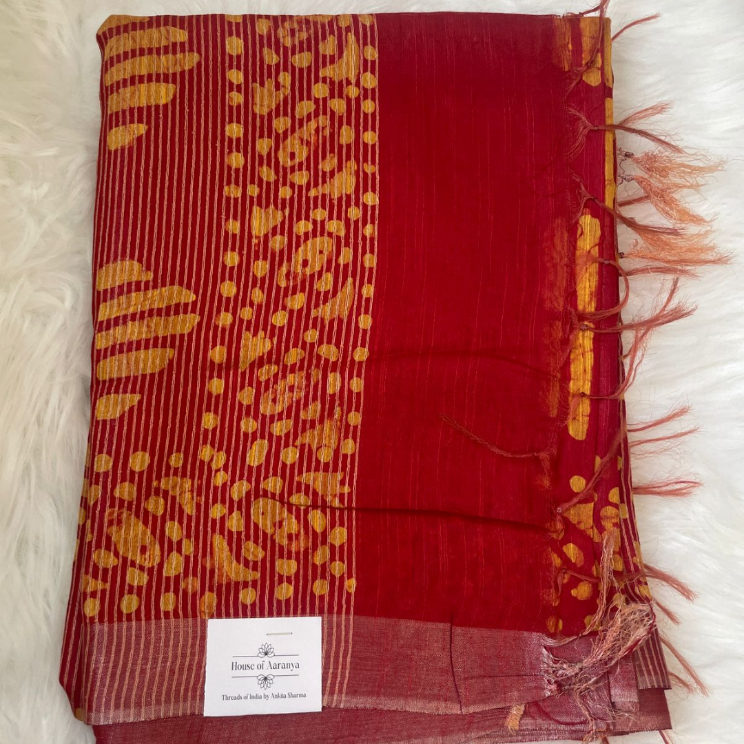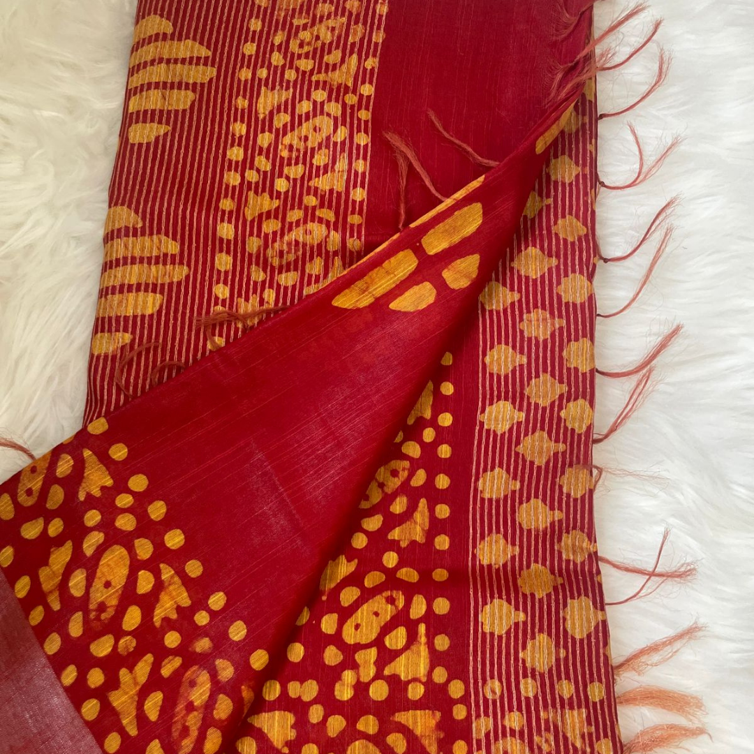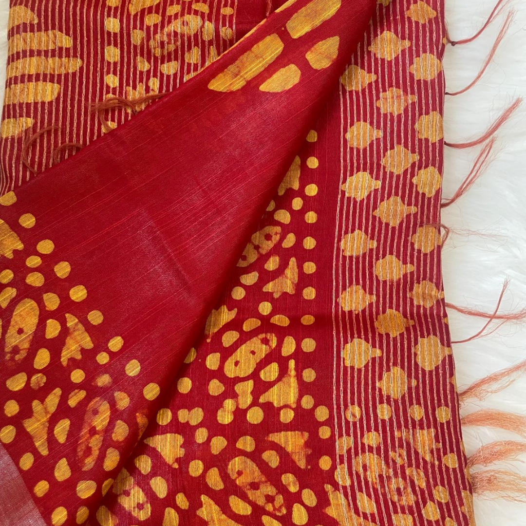 The saree showcases authentic batik print patterns in golden hues, creating a striking contrast against the rich red base. The intricate motifs and striped detailing enhance its ethnic appeal, while the lightweight texture ensures all-day comfort.