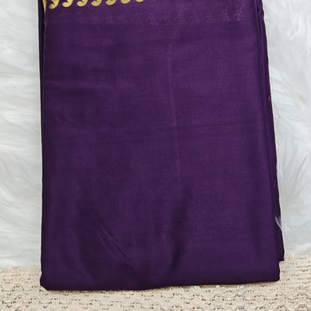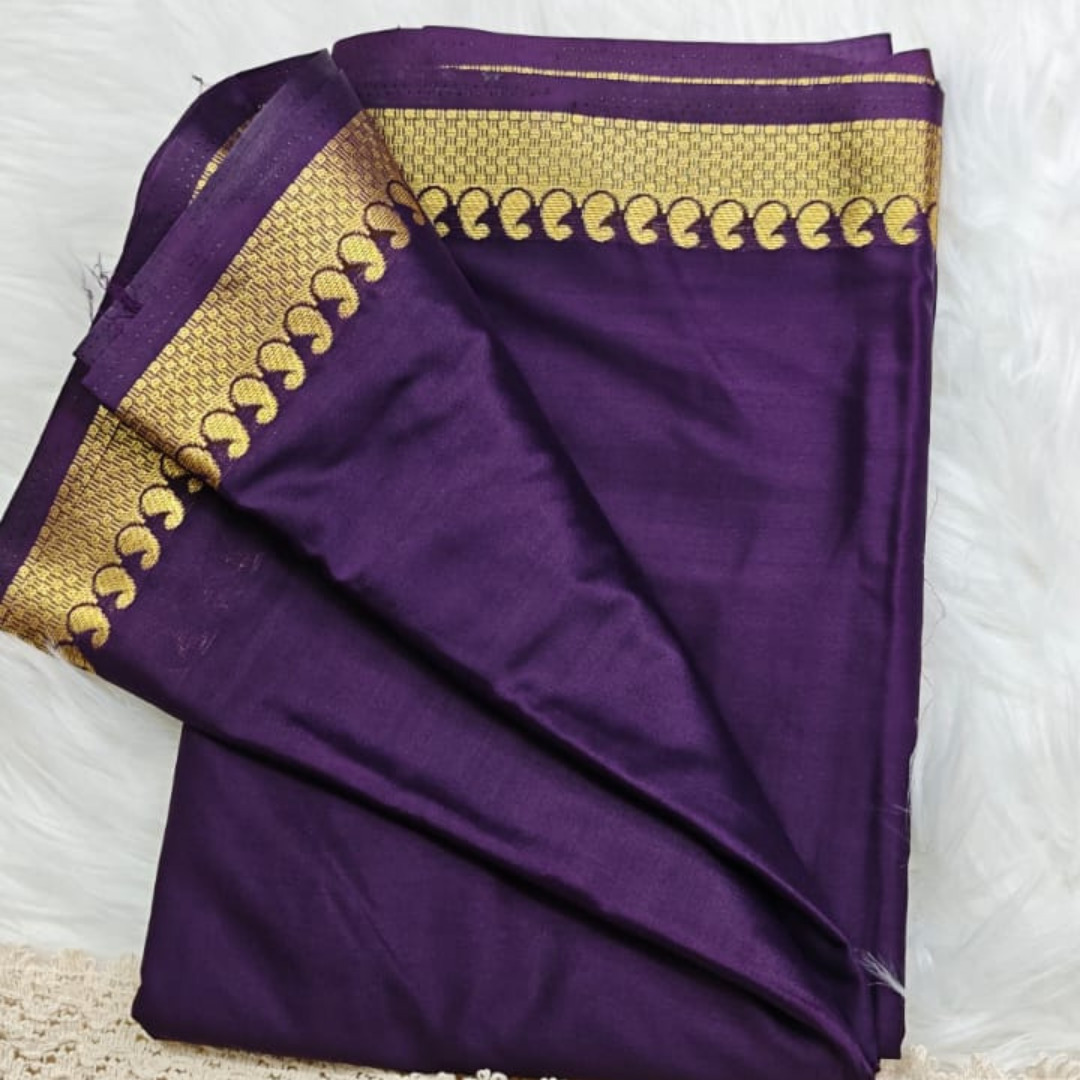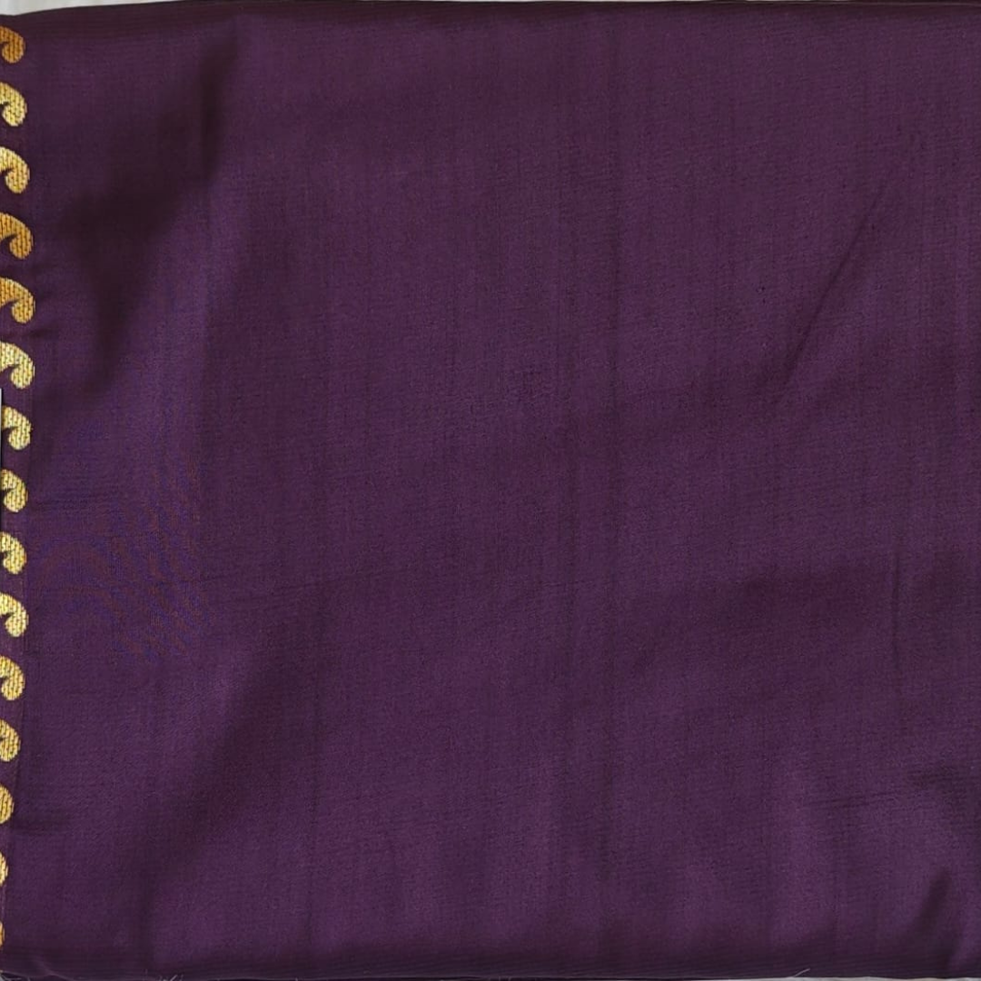 Make a bold and elegant statement with this stunning wine purple silk saree, crafted for timeless beauty and sophistication. The deep, rich color enhances its regal appeal, while the intricately woven golden zari border adds a touch of traditional grandeur.